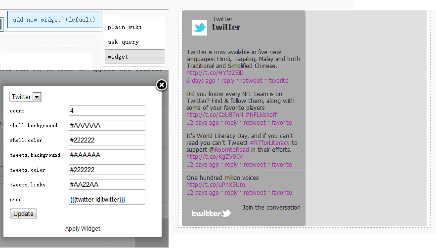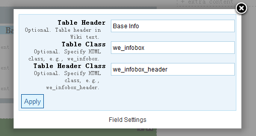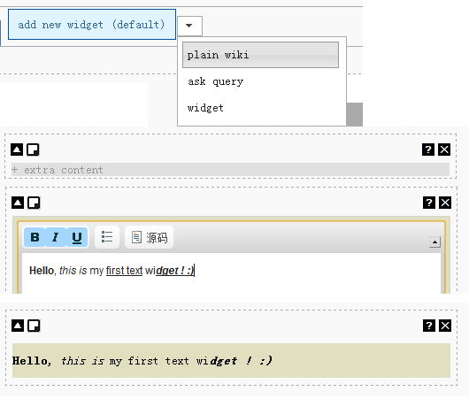 * To fill in widget parameters with certain field value, please use 'field widget' with 'hidden field' view. Plain text widgetPlain text widget help users to put in standard wiki text, a simple WYSIWYG is applied. Users can add special parser functions / templates here.