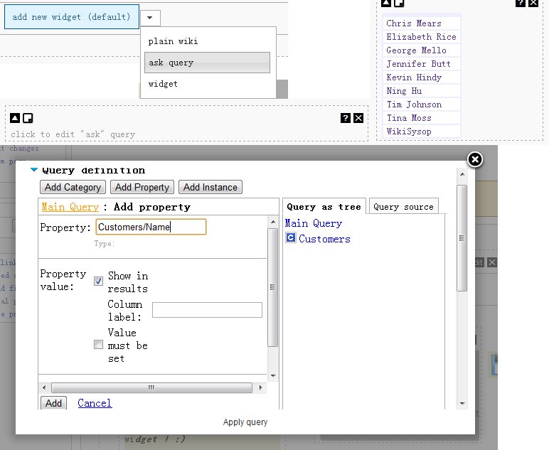 Query widgetSMWHalo is a great extension to help improve SMW work. Its 'QueryInterface' tool helps user build up #ask queries.